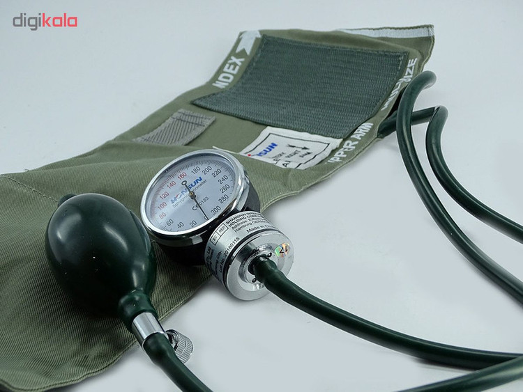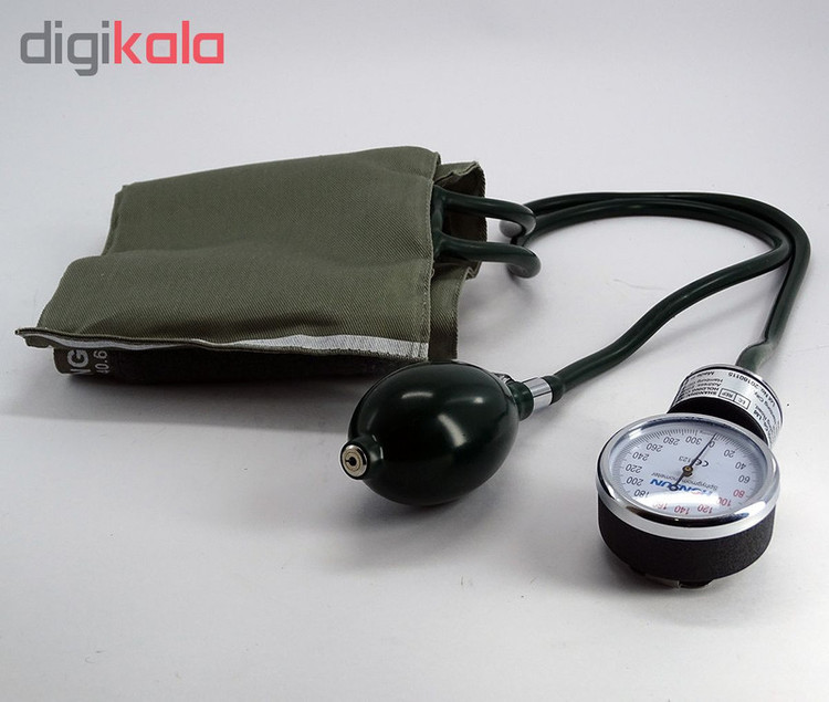 دارای گوشی دو پاویونه بدون نیاز به برق و باتری صفحه نمایش گرد ساعتی مانومتر با زمینه سفید و نوشته های مشکی و قرمز درشت